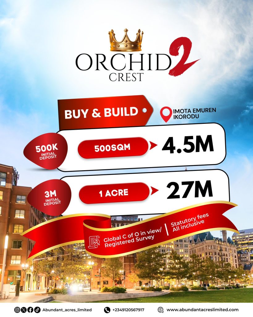Welcome to Orchid Crest , A buy and build property situated in the thriving and well-planned community of Ajepa, Imota Ikorodu. Whether you’re building your dream home, investing in rental properties, or securing your next big real estate venture, Orchid Crest is tailored to meet your aspirations.
