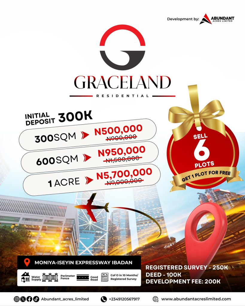 We’re excited to present Graceland Residential, a top-tier development by Abundant Acres Limited offering prime land opportunities in the heart of Moniya,Ibadan.