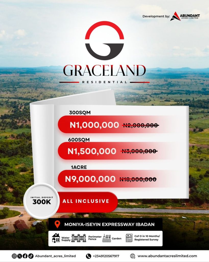 We’re excited to present Graceland Residential, a top-tier development by Abundant Acres Limited offering prime land opportunities in the heart of Moniya,Ibadan.