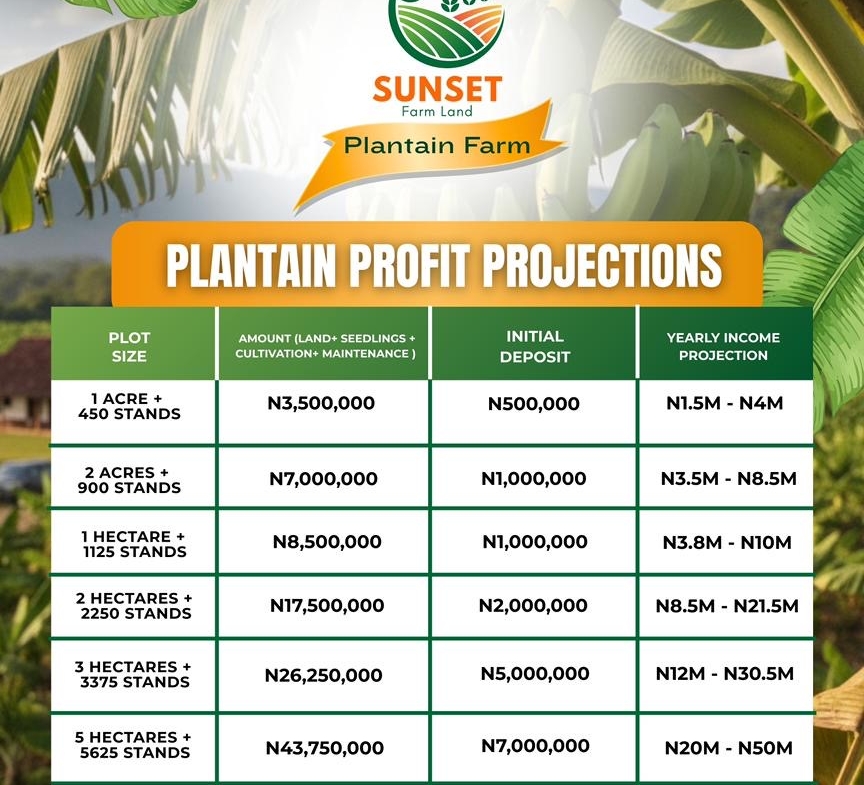 Secure your Acres/ Hectares and grow your wealth in agriculture with Sunset Plantain Farm today.