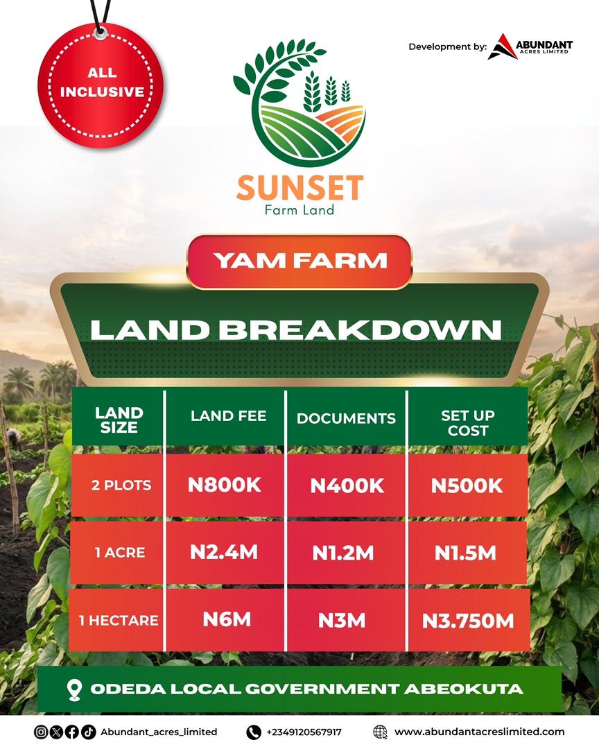 Here’s your chance to own yam plots in Sunset farm, a legacy that truly grows with every harvest .